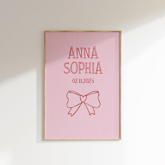 Navneplakat med sløjfe | Plakat med barnets navn og fødselsdato