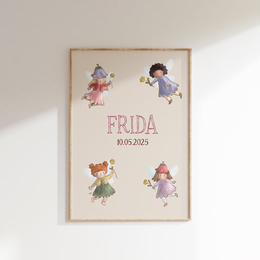 Navneplakat med feer | Plakat med barnets navn og fødselsdato