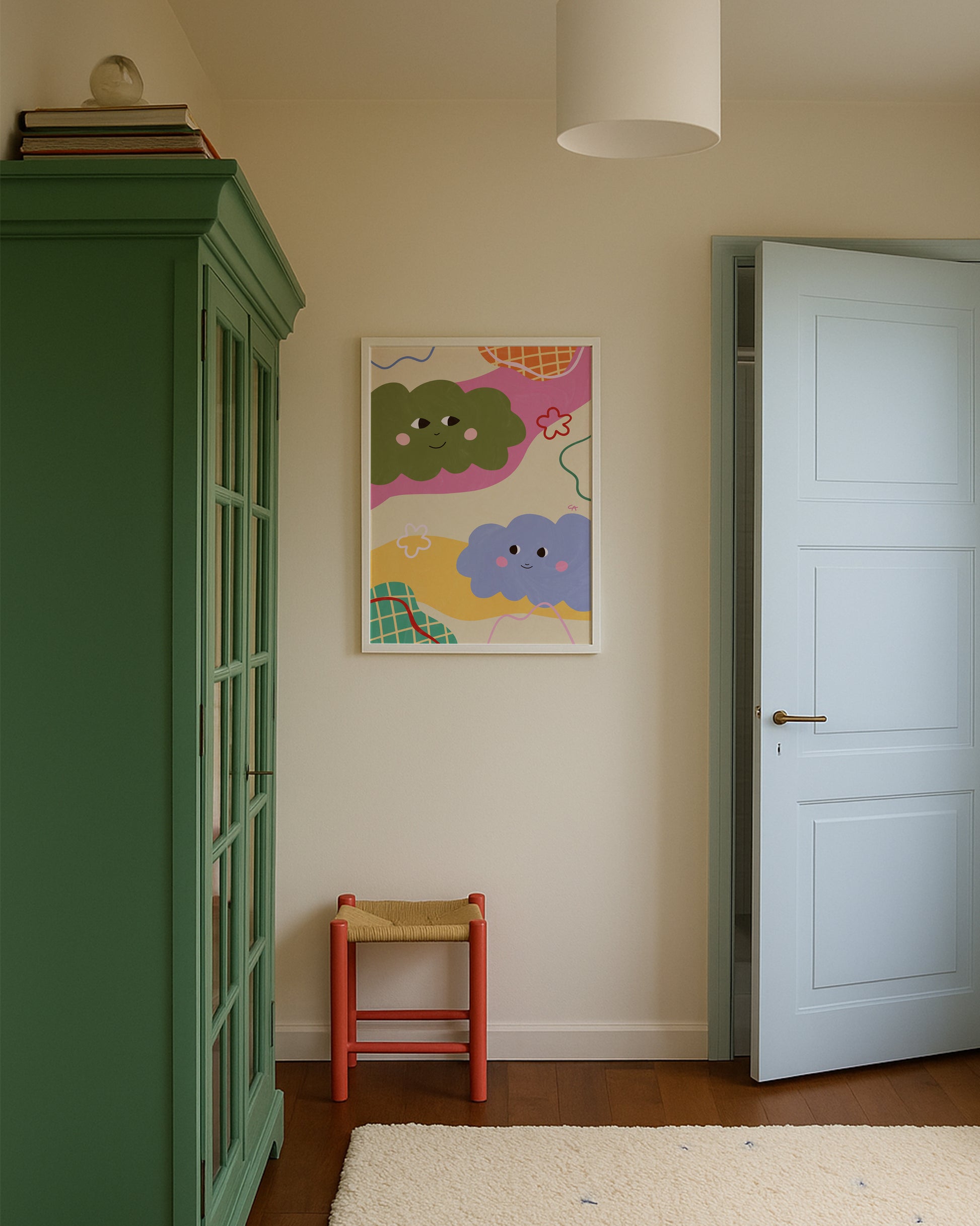 Fin og farverig plakat til børneværelset som indbyder til leg og gode stunder.