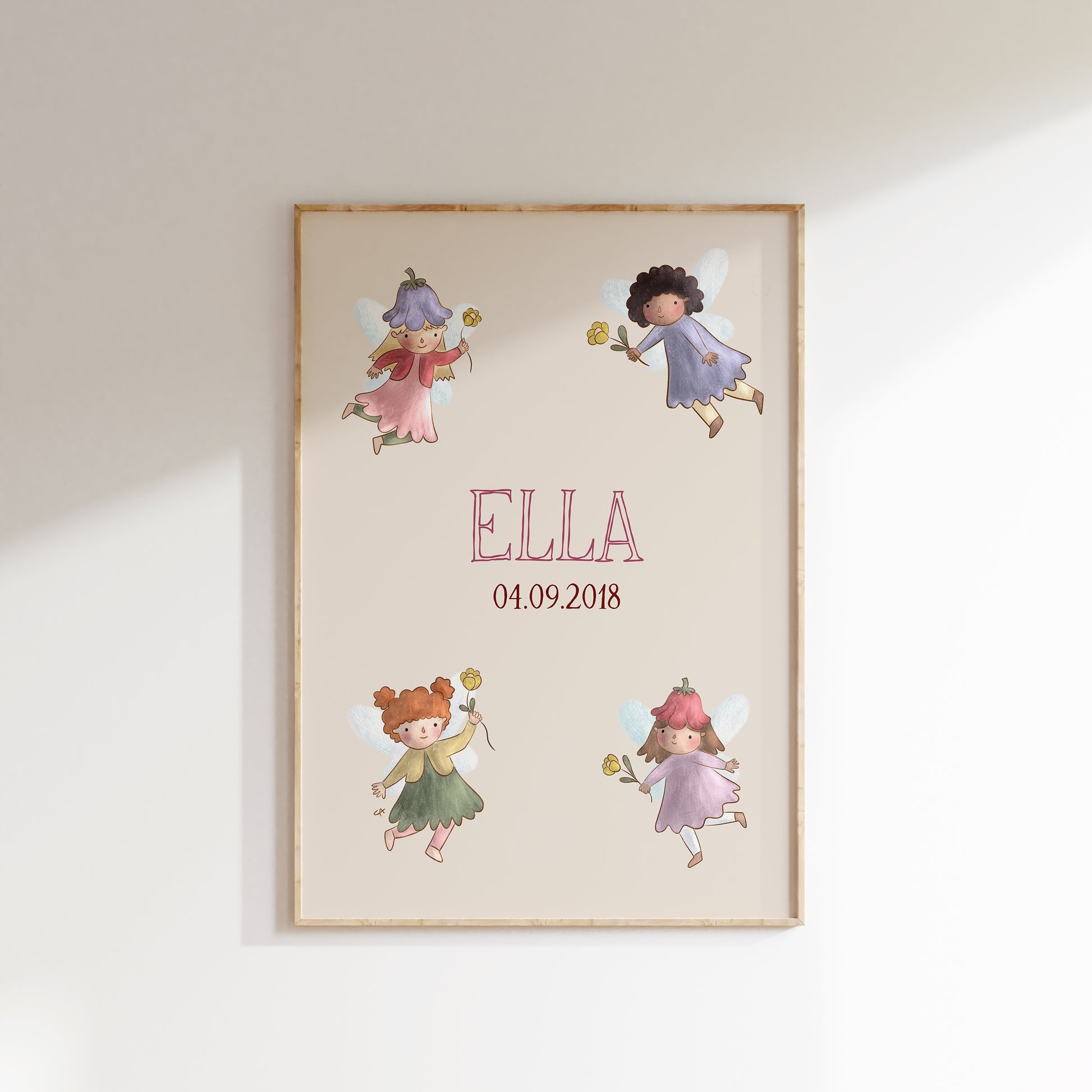 Navneplakat med feer | Plakat med barnets navn og fødselsdato