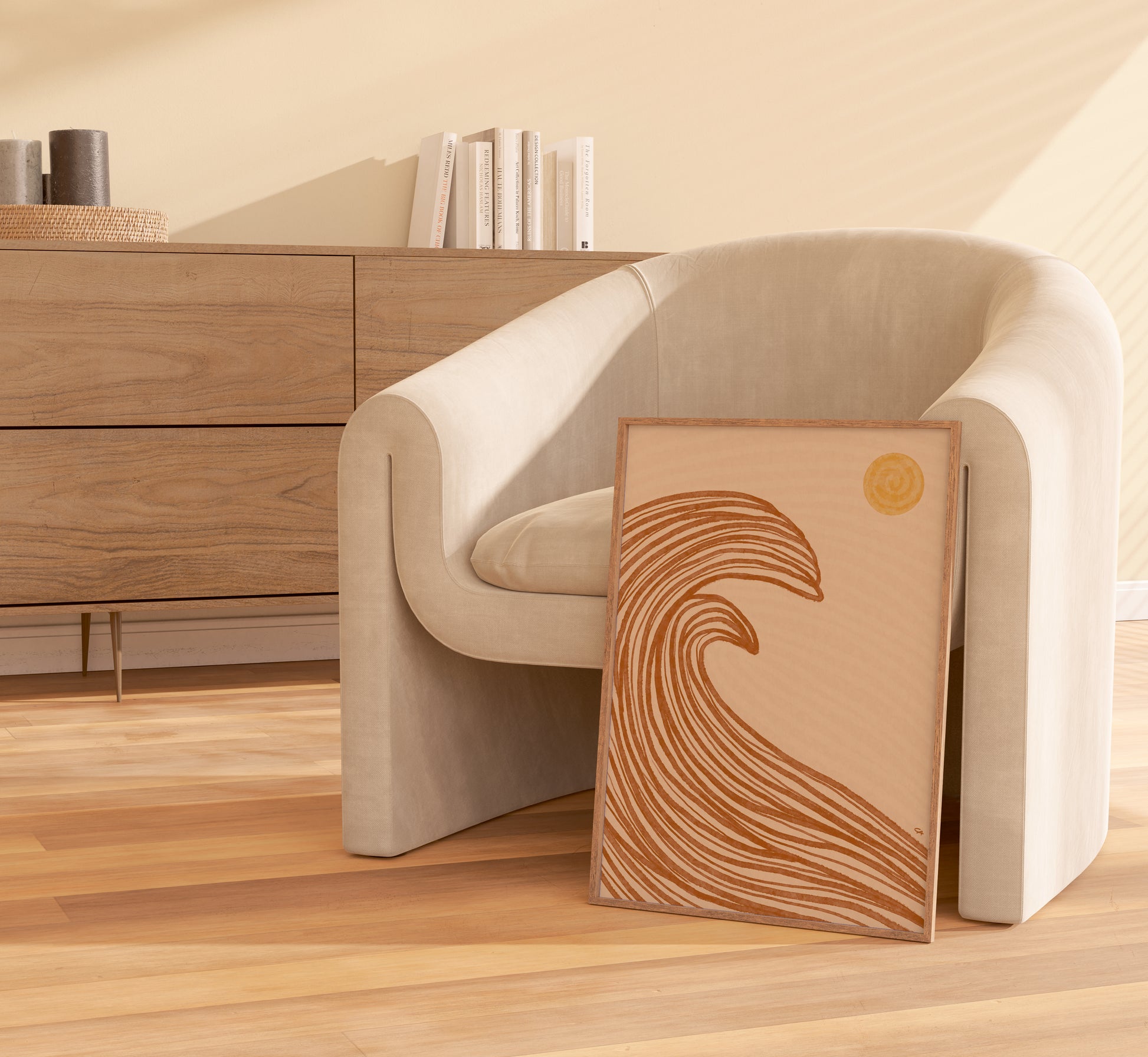 Ocean Flow er en kunstplakat, der indfanger havets kraft og bevægelse i et enkelt, organisk formsprog. Den store bølge, tegnet i varme orange toner, skaber en følelse af både styrke og ro – som en påmindelse om naturens evige rytme. Den gyldne sol i hjørnet tilføjer balance og en varm energi, der gør motivet levende og harmonisk.